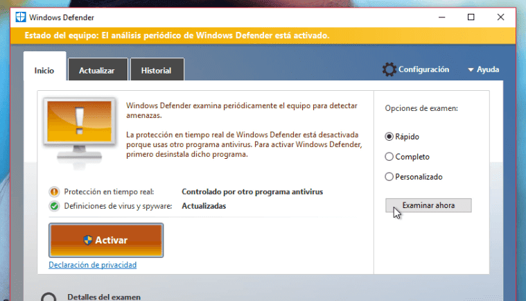 Esta opción le Permite que, de vez en cuando Windows Defender realice una exploración para comprobar si hay cualquier tipo de malware que su antivirus favorito no detecto. Sin embargo, no está habilitado de forma predeterminada.